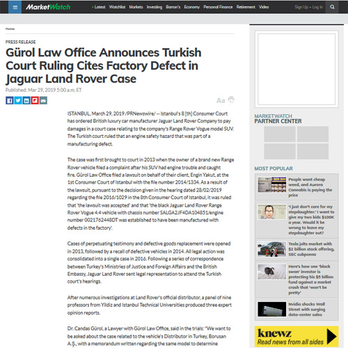 Gürol Law Office Announces Turkish Court Ruling Cites Factory Defect in Jaguar Land Rover Case
