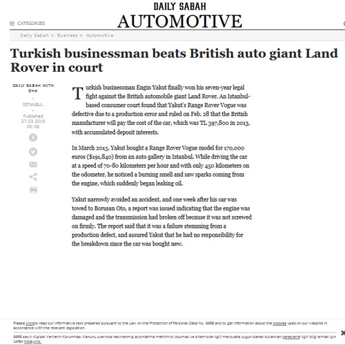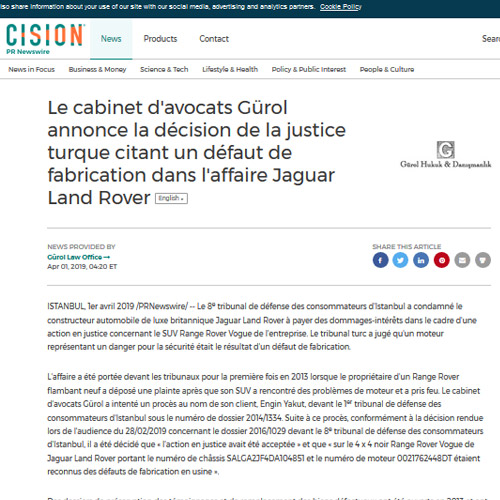 Le cabinet d'avocats Gürol annonce la décision de la justice turque citant un défaut de fabrication dans l'affaire Jaguar Land Rover